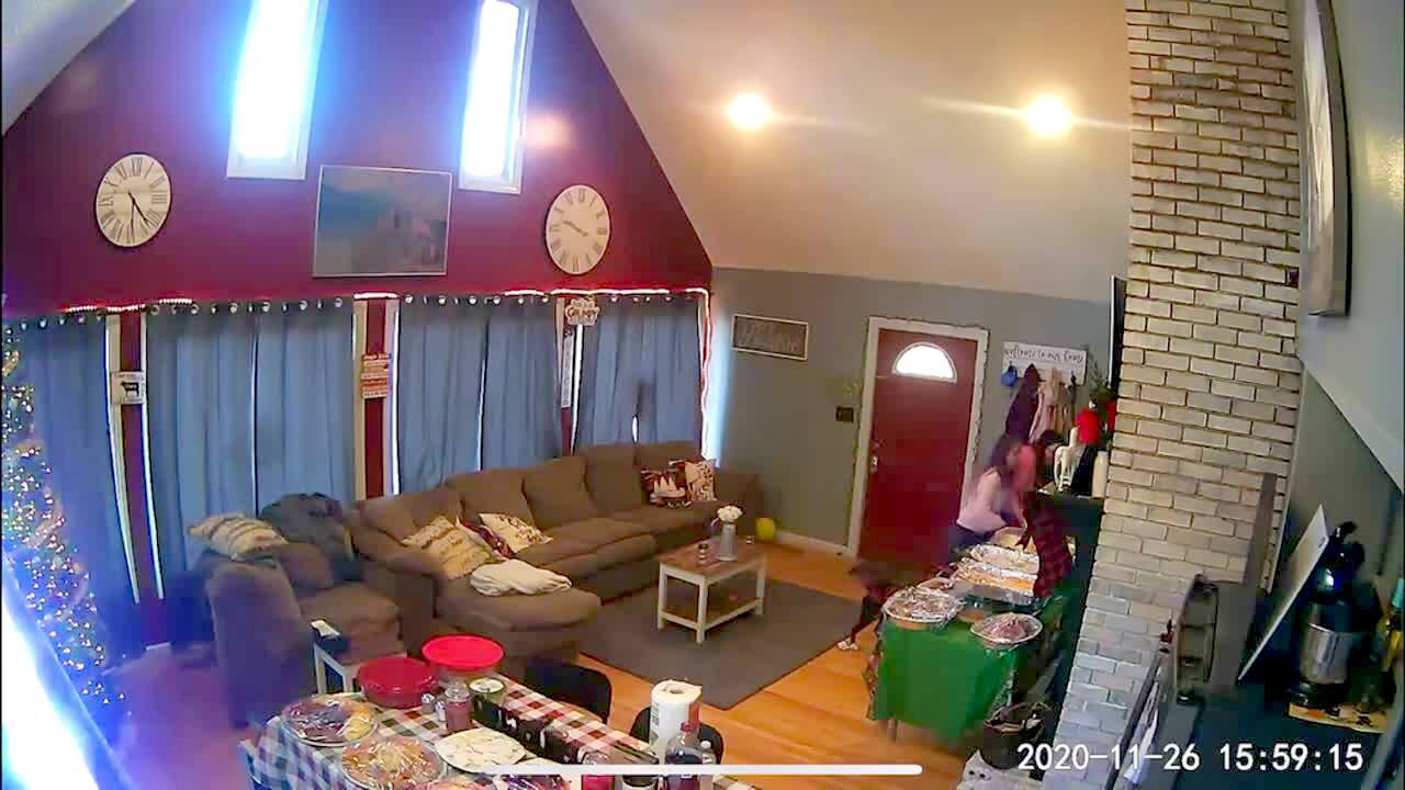To make room in a living room, two women attempt to push a table covered with trays full of Thanksgiving food. The table collapses and the food falls onto the floor . Security camera footage.