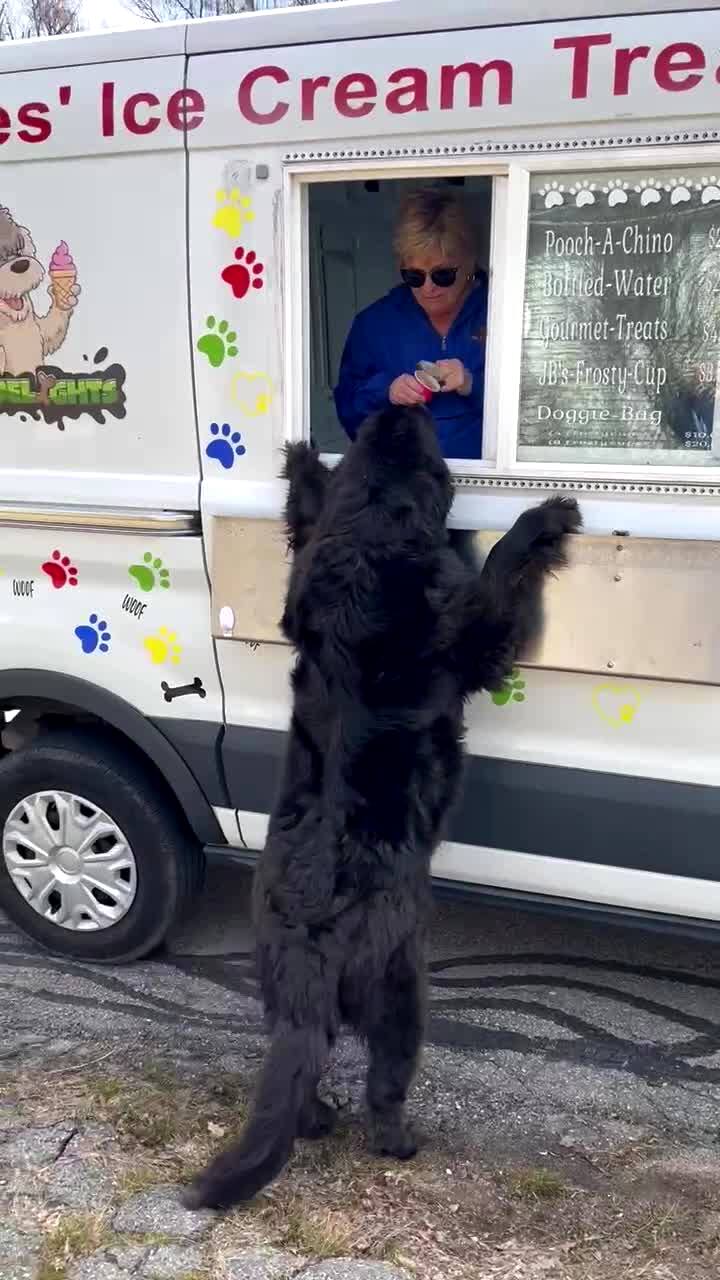 A dog runs up to an ice cream truck, puts its paws on the window and retrieves an ice cream bar from a woman in the truck.