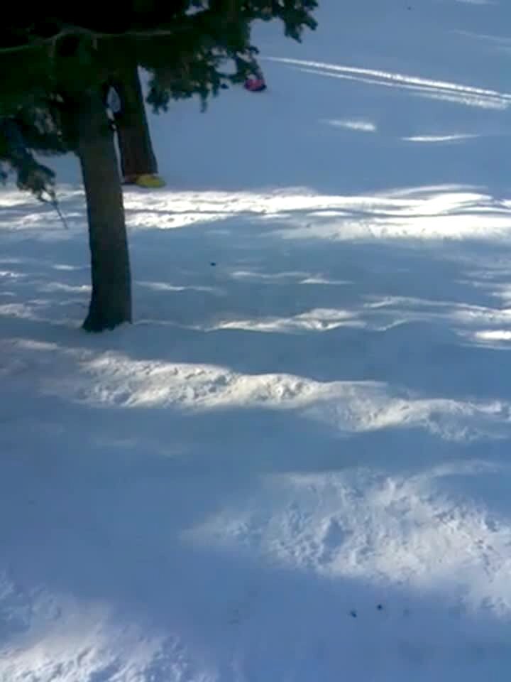 A father runs through snow in a yard and pulls his young daughter's sled behind him. When he lets go the girl slides down a hill and across the street as he chases after her.