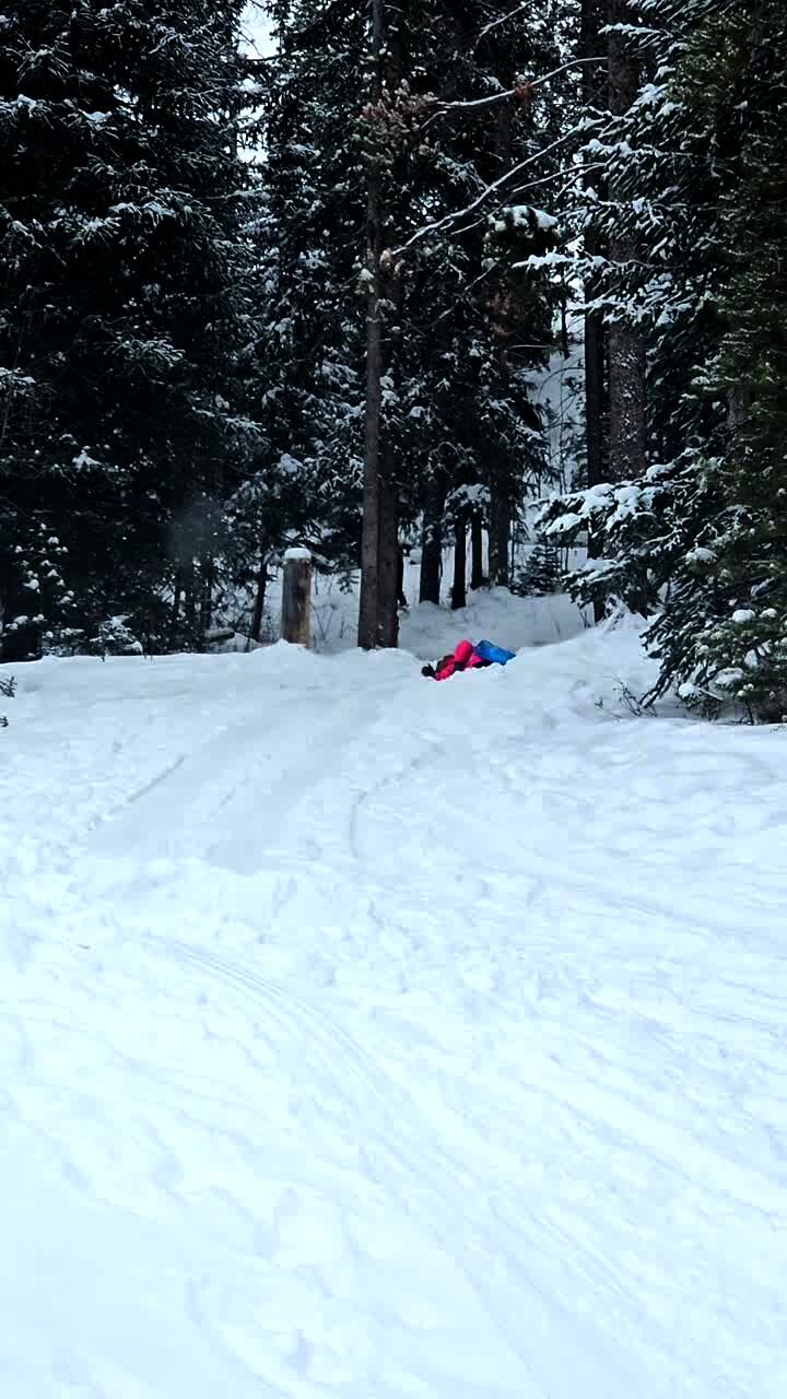 Girl sleds downhill for the first time. She goes further than expected and ends up in the forest.