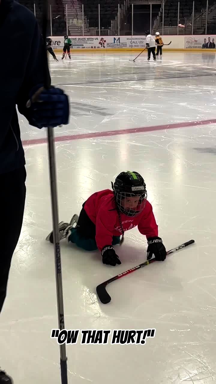 A young girl attempts to play hockey as she says, "I'm doing it, mom!" then loses her balance and face-plants onto the ice rink, instead. Slow motion. Featured talent cleared ONLY (the girl who falls on the ice).