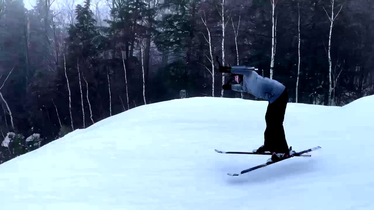 Two kids ski over a jump and continue down the hill on snow. The third child goes over the ramp and lands on their back. Short tail.