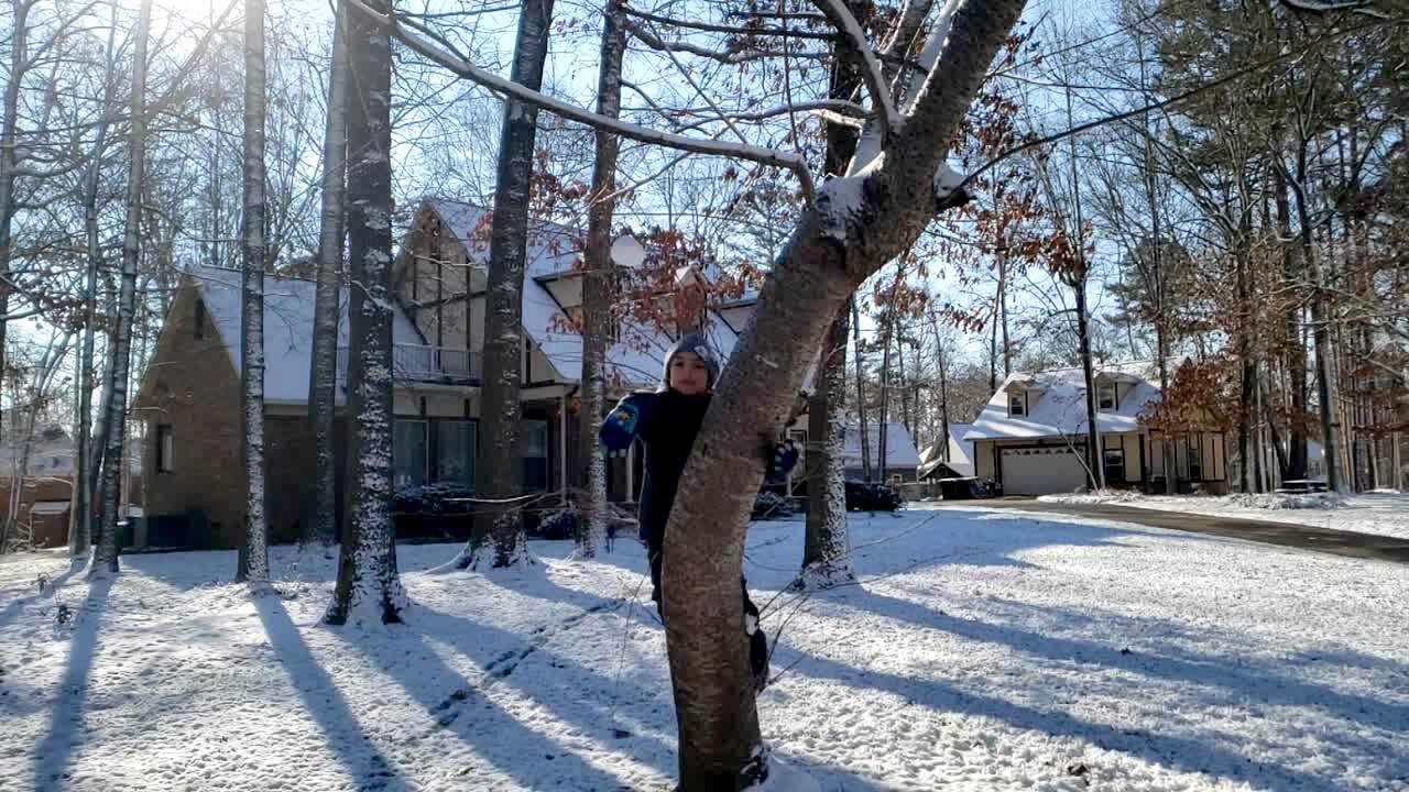 A young boy throws a snowball to the camera in a yard, and the camera goes black. Slow motion.