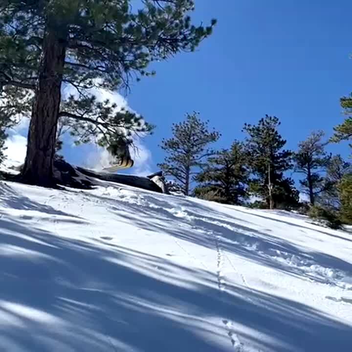 Two men are sledding down a snowy hill when they go over a jump. They fly into a tree branch and crash and fall.