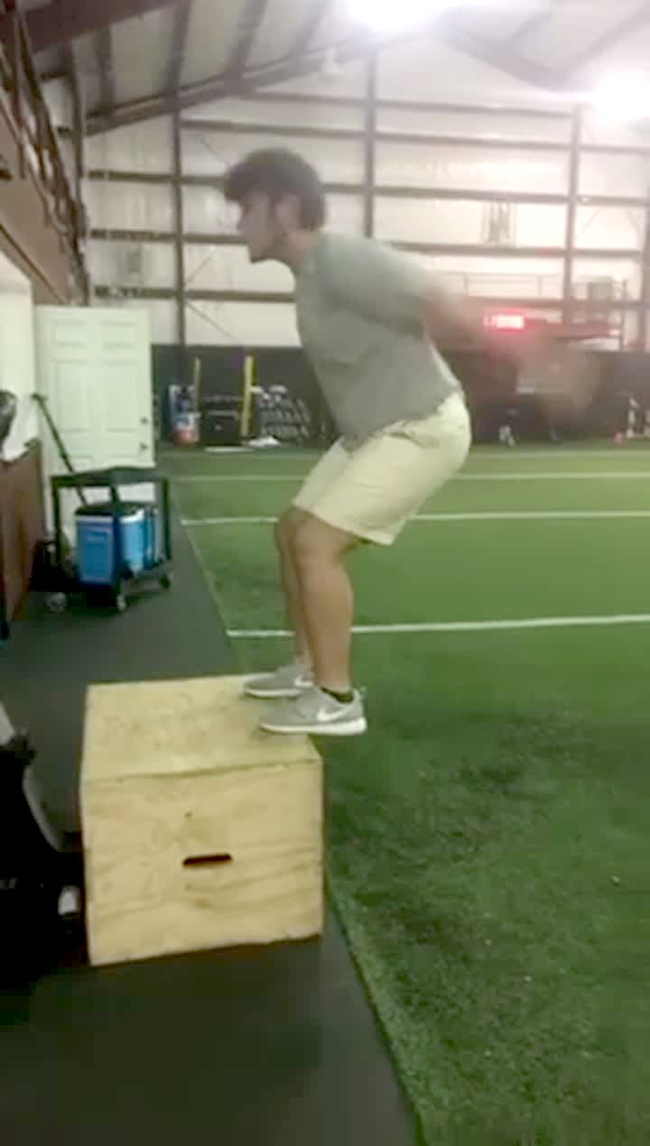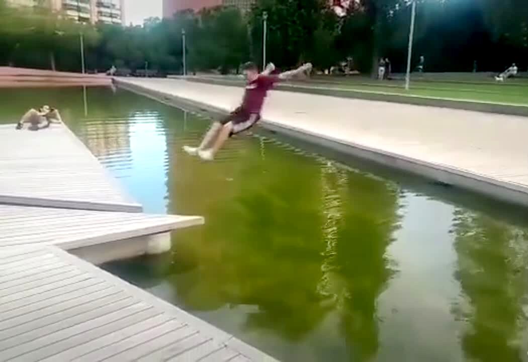 A teen boy attempts to run and jump over a pond and onto a deck but he falls short and smacks into the side of the deck instead. Featured talent cleared (the teen who jumps).