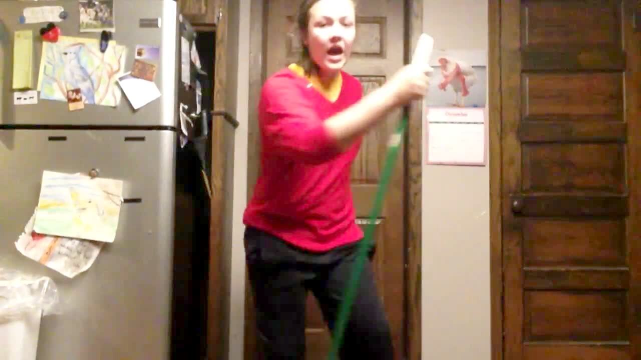 A teen girl dances with a broom in the kitchen as she uses it like a microphone stand. She puts the broom between her legs, then trips and falls.