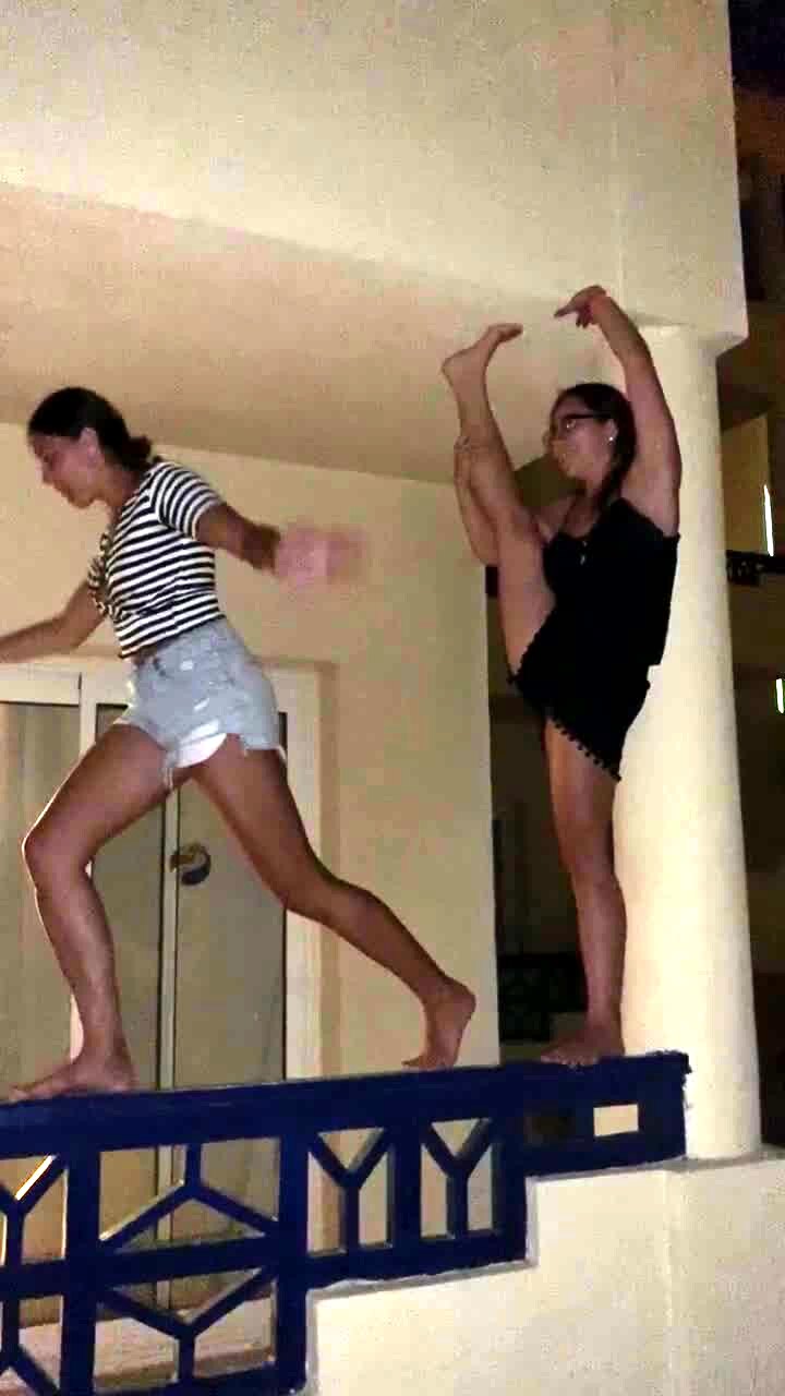 A teen girl falls in a parking structure when her shorts catch on a concrete block as she jumps over it.