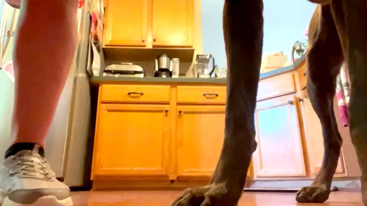A woman sets up a camera in a kitchen and tells a chocolate Labrador retriever puppy dog to "leave it" while she does push-ups, but he moves the camera away from her twice.