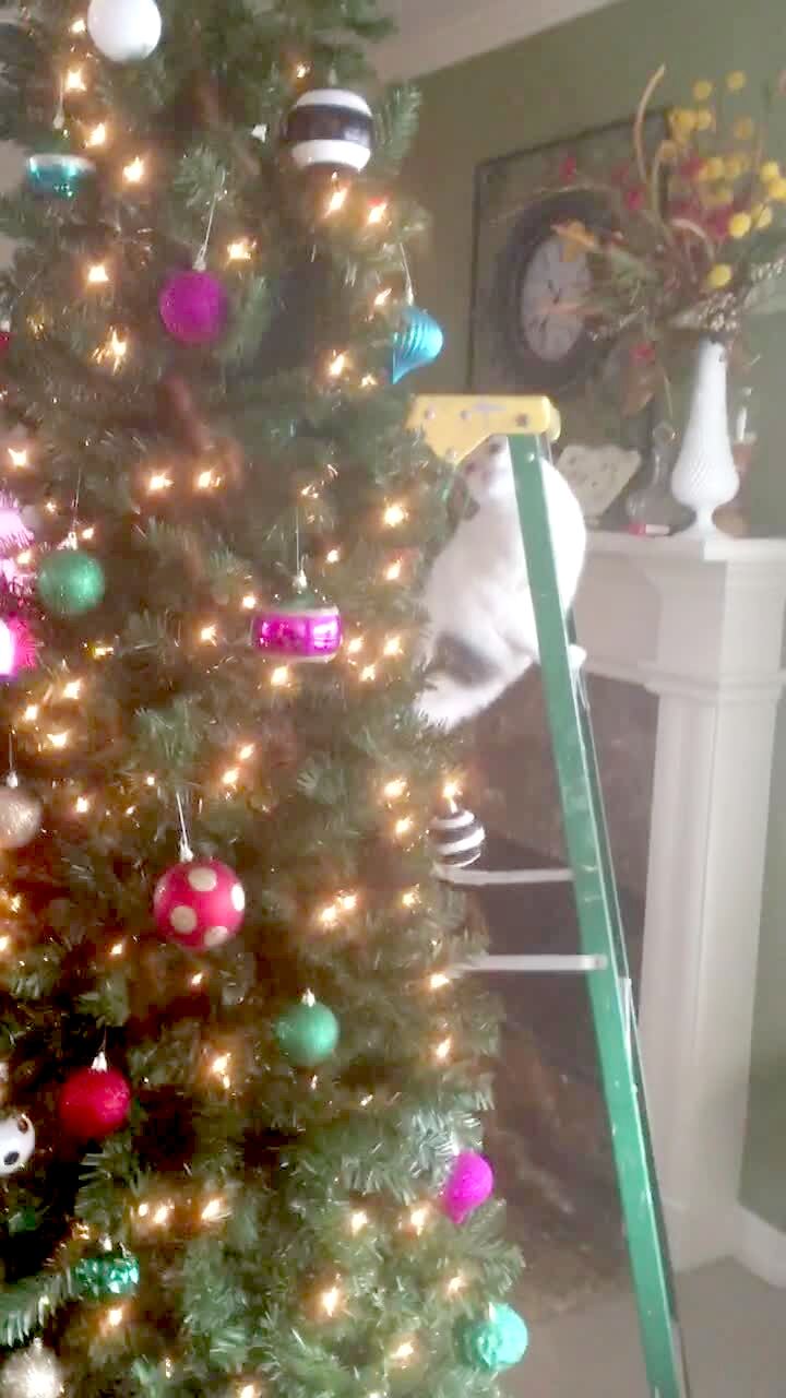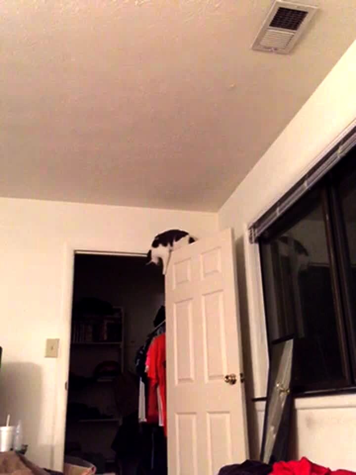 Cat climbs various heights to get treats. He climbs the fridge, cabinets and jumps to the door.