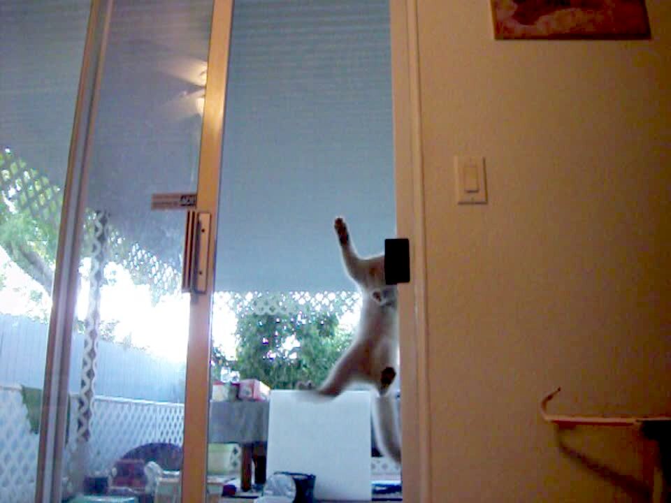 Cat climbs over the top of a screen door then climbs back down to get inside the house. Short clip. Silly pet trick.