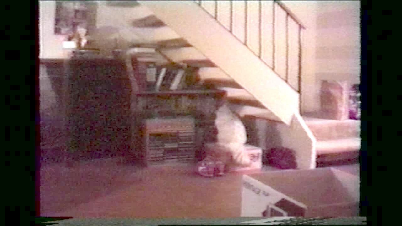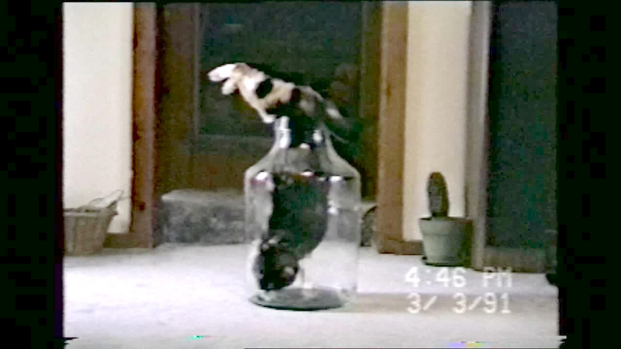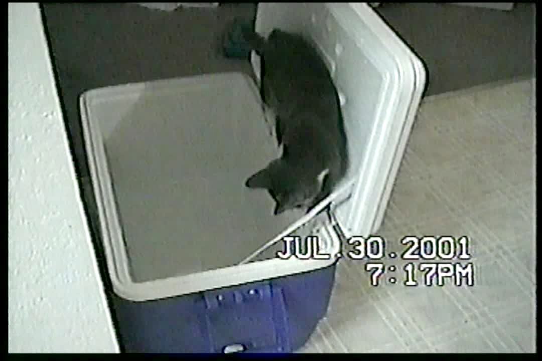 Cat in kitchen climbs around on ice chest, falls in. Cooler has icy water in it, cat goes crazy and accidentally pulls cooler top / lid down on itself, then finally gets out. Freezing, cold.