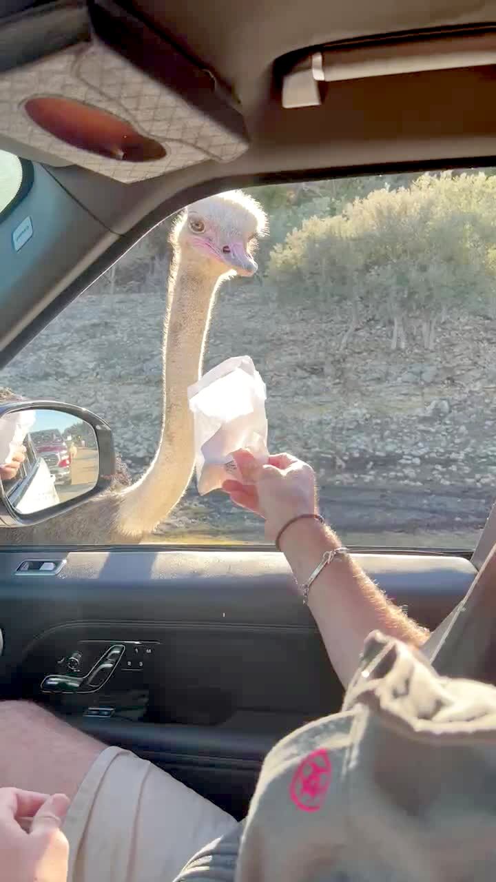 A man feeds an ostrich bird in the car at a drive through safari, then it leans away from the food bag and bites a bracelet off of the man's wrist.