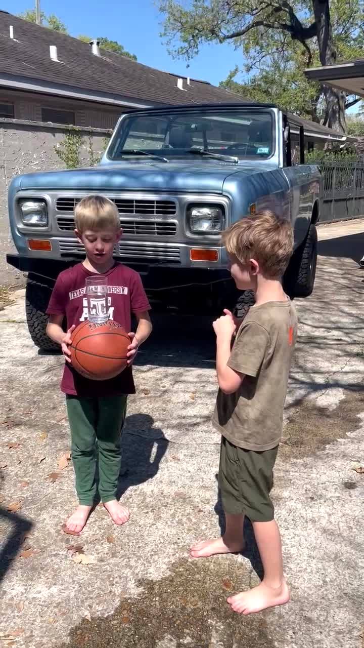 A young boy tries to bounce a glass of water on a basketball but it splashes up onto another young boy in a driveway.
