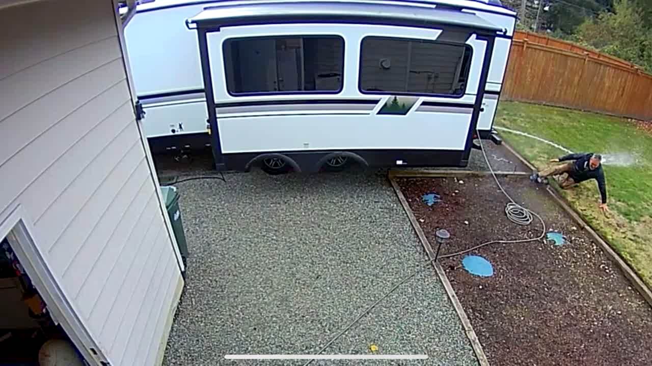 A man removes a drain plug from the back of a camper. Water shoots out towards him, knocking him down in the backyard. Security footage