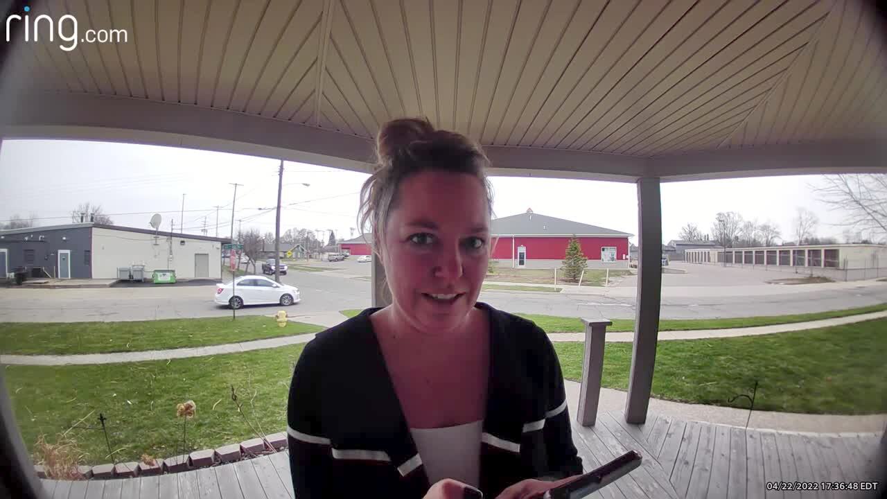 Security footage of a young girl who tries to get someone's attention in the house. She first throws a football to the camera and misses. Then she throws a Slinky spring and it lands perfectly on the camera. Loud noise