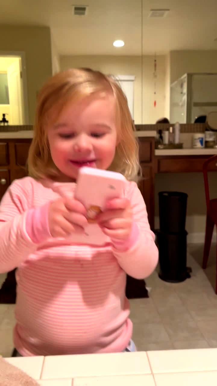 A sassy tot girl stands at a kitchen counter and takes selfies on a toy phone before she says, "I'm just posting these to my boyfriend."
