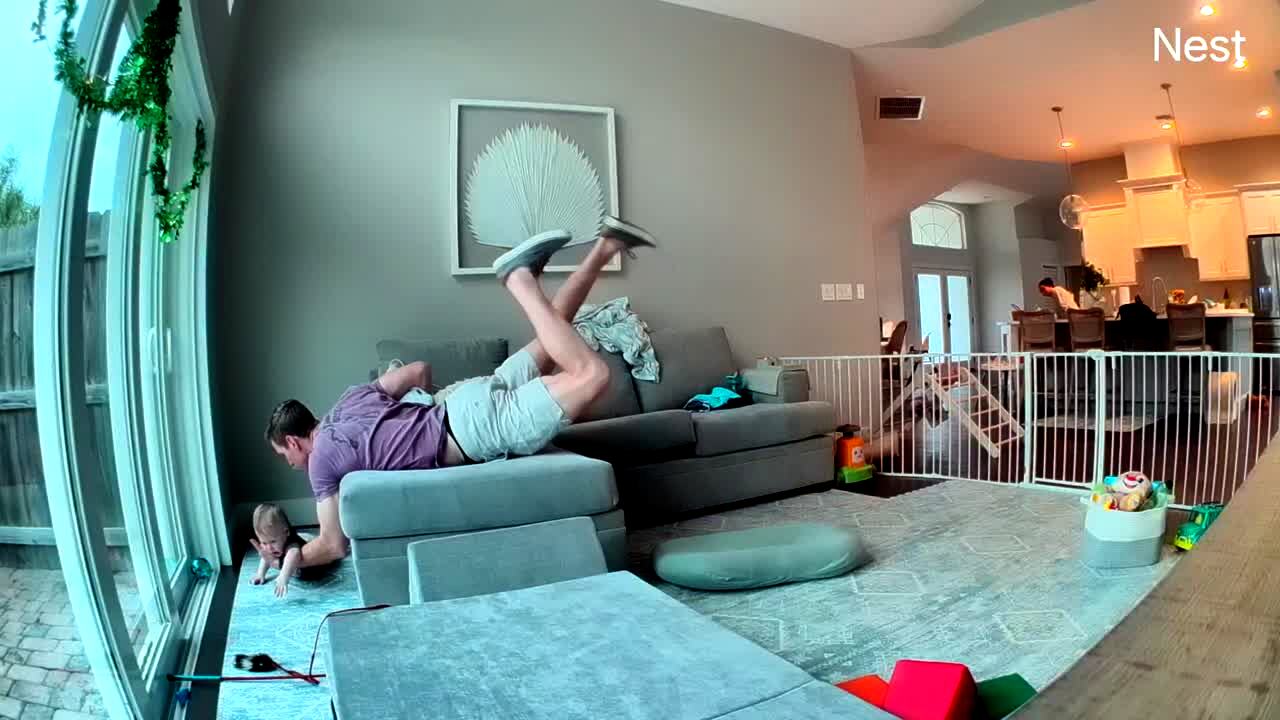 A baby boy hits a man in the groin on the living room couch. Security footage.