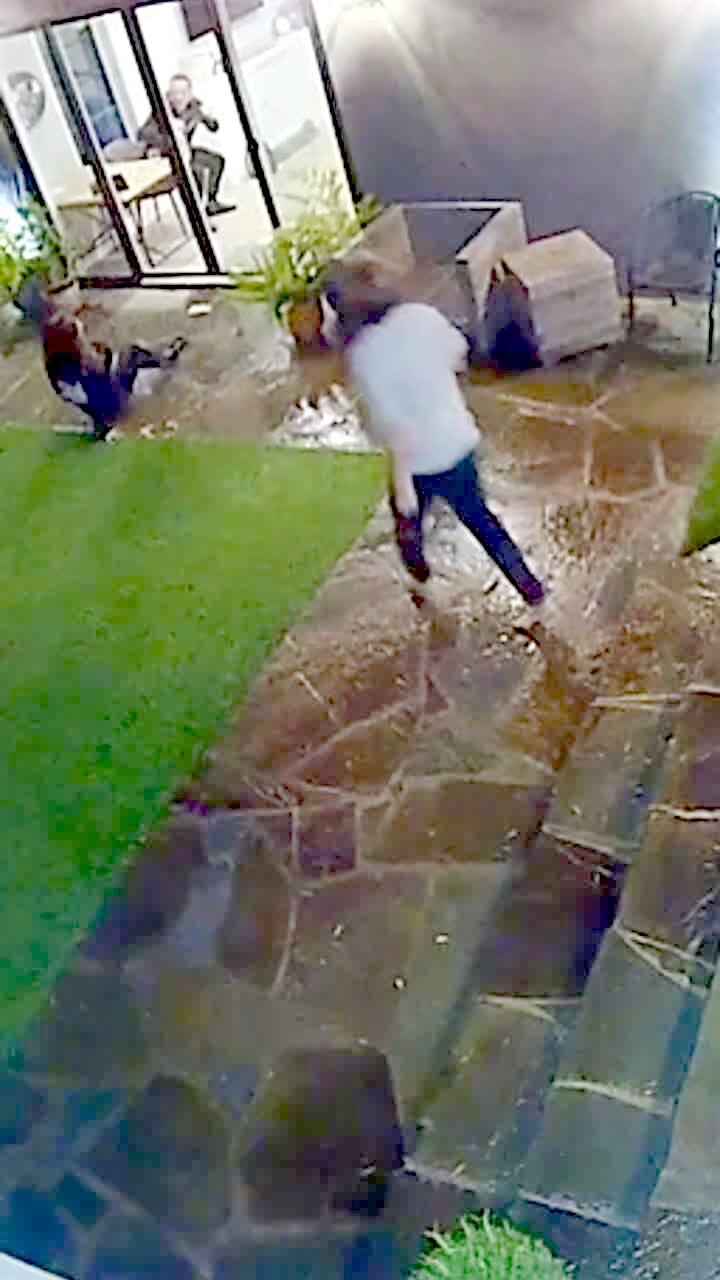 A young girl on her patio tries to run into the house to show a man something but runs into the sliding glass door instead. The dad asks the daughter if she's OK as she laughs. Security footage.