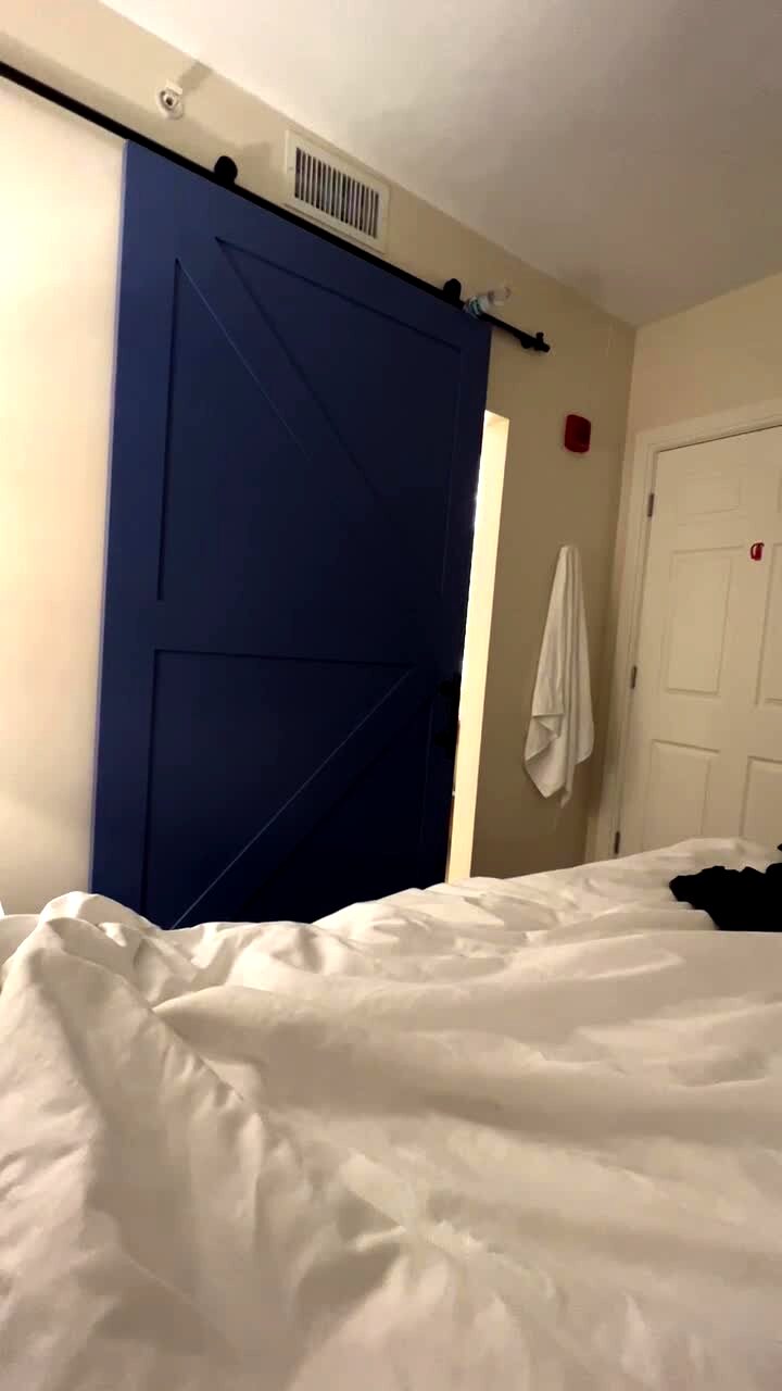 A teen boy walks through a doorway before a rigged water bottle falls off the doorframe and hits him on the head as he falls onto the bed.