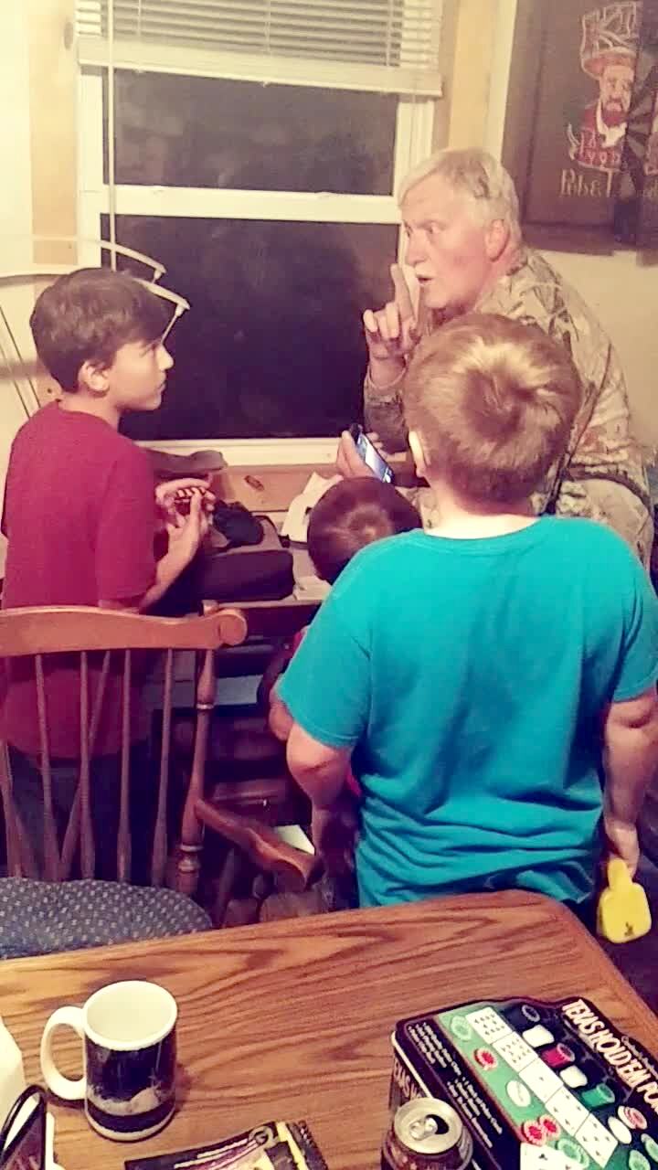 A young boy tells a man to try to fire an elastic band like a sling shot off of his foot, but it smacks back into his foot.