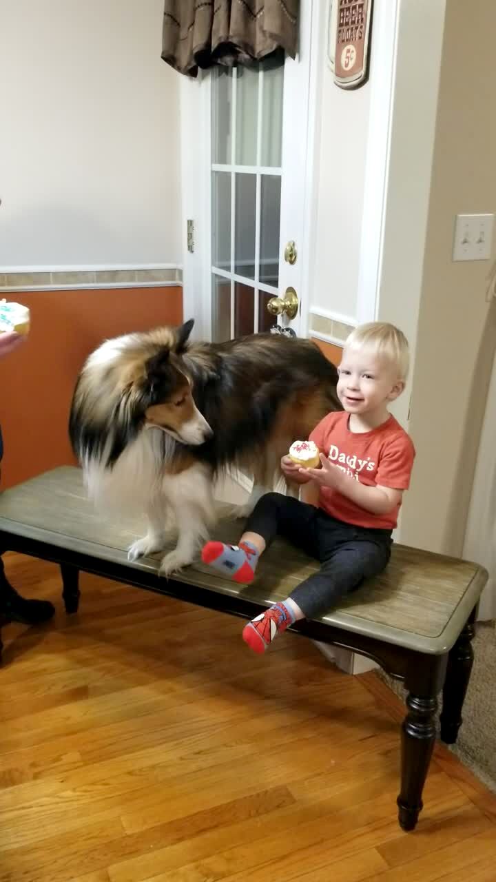 A family does a gender reveal using cupcakes, with the revealing color inside the cakes. Their dog eats its own cupcake whole while the tot boy cries and shrieks and then throws his cupcake to the dog. The dog eats that one too. The color inside the cupcakes is never revealed because the dog eats the whole cupcake both times.