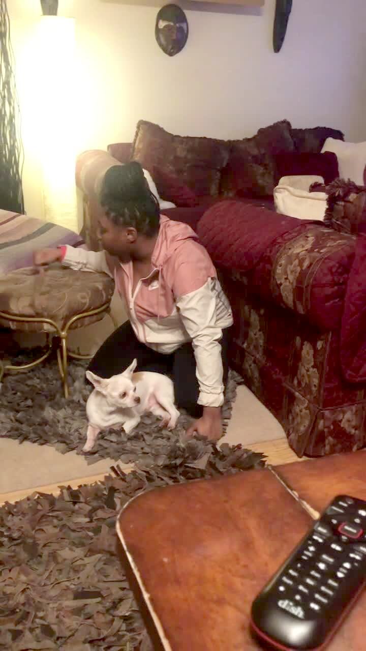 A dog sits on a woman's lap in a room in a house. A man offscreen asks the dog if he wants a treat. Every time anyone says "treat", the dog's ears perk up.