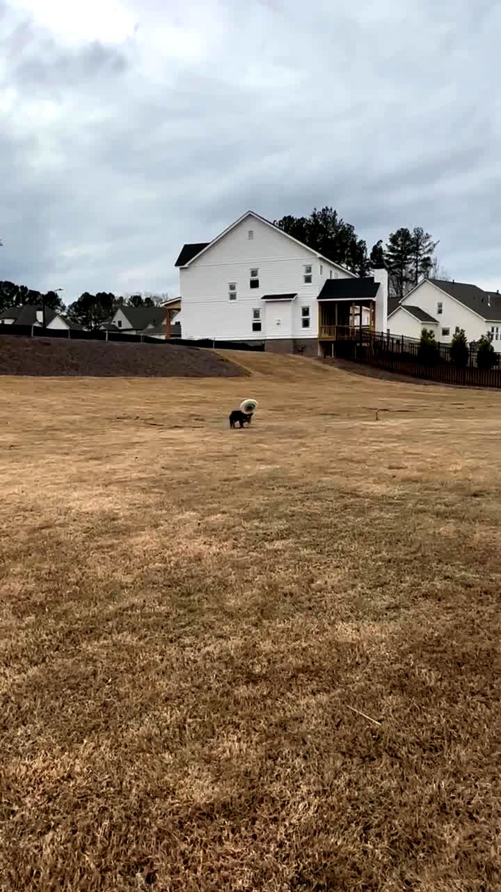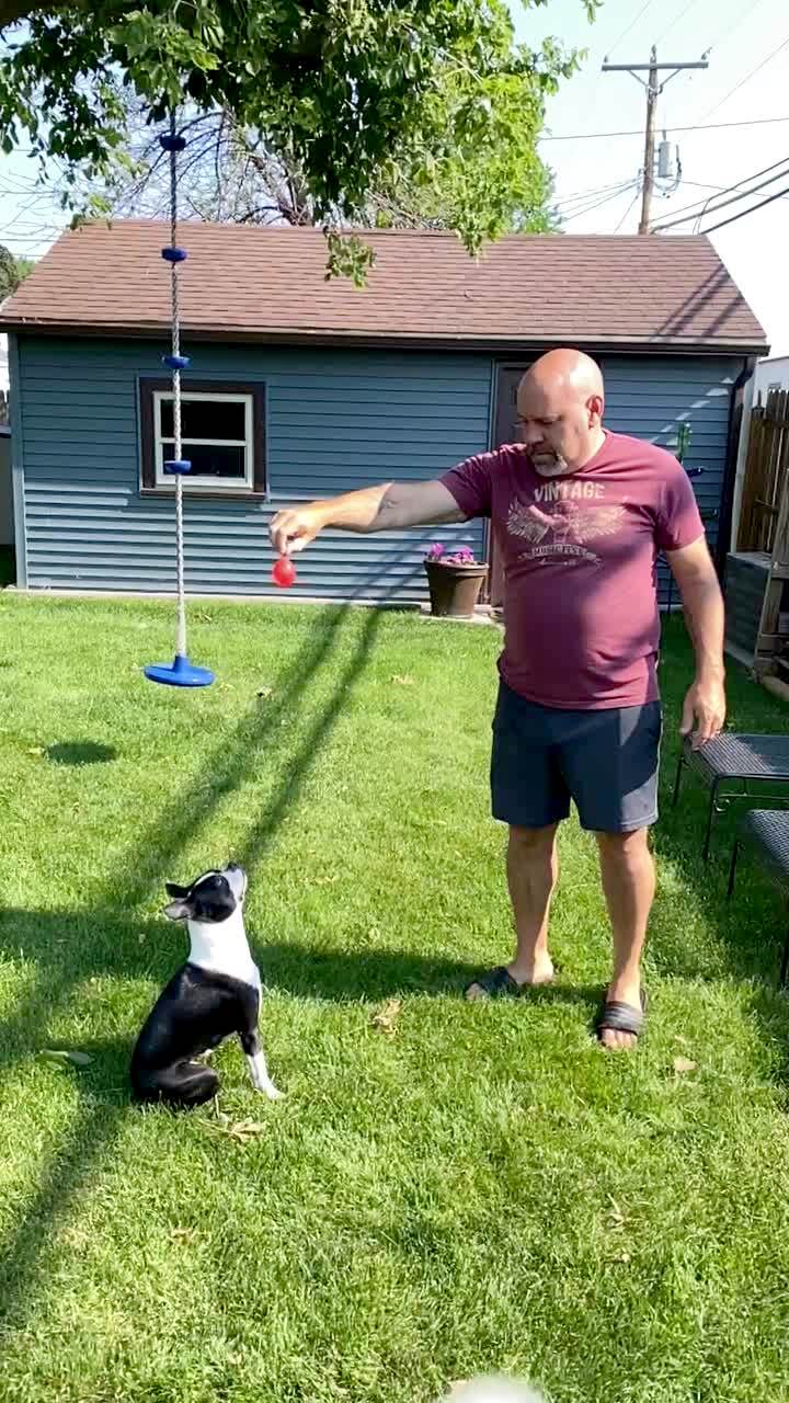 A Boston Terrier dog jumps up in a yard to reach a water balloon in a man's hand but kicks the man in the groin. Slow motion.