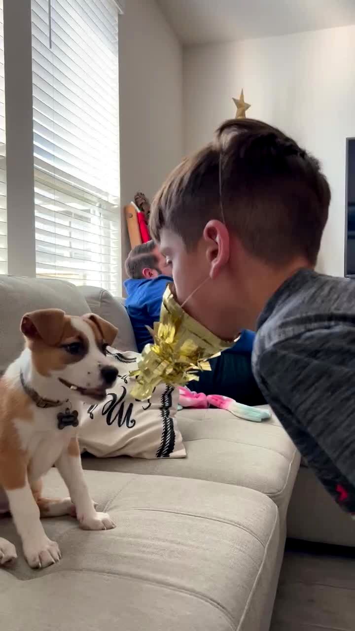 A young boy holds a squeaking horn under a party hat that he wears on his face. He honks the horn in the face of a puppy dog sitting in a living room. The dog bites at the hat; pulls on it and the hat snaps back, hitting the boy in the face. The boy laughs.