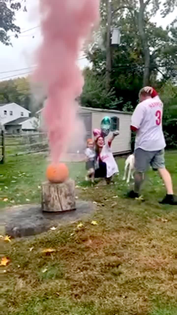 A woman films a gender reveal party outside in a backyard. The gender reveal goes wrong, when the pumpkin spews out blue smoke, instead of pink. Then pink smoke appears and they are happy they are having a girl.