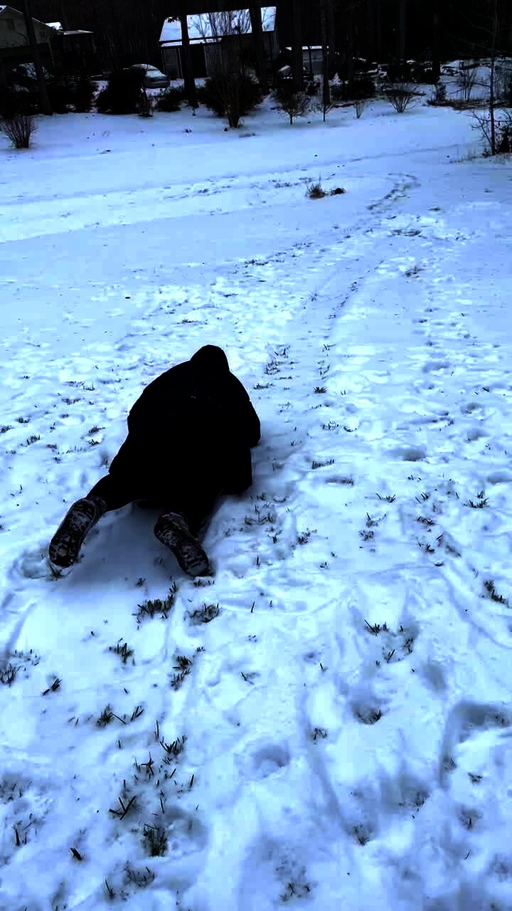 A woman attempts to sled down a snow hill on her stomach. She cannot do it. Then she flips over in frustration. She she slides down the hill on her back. A dog comes to check on her.