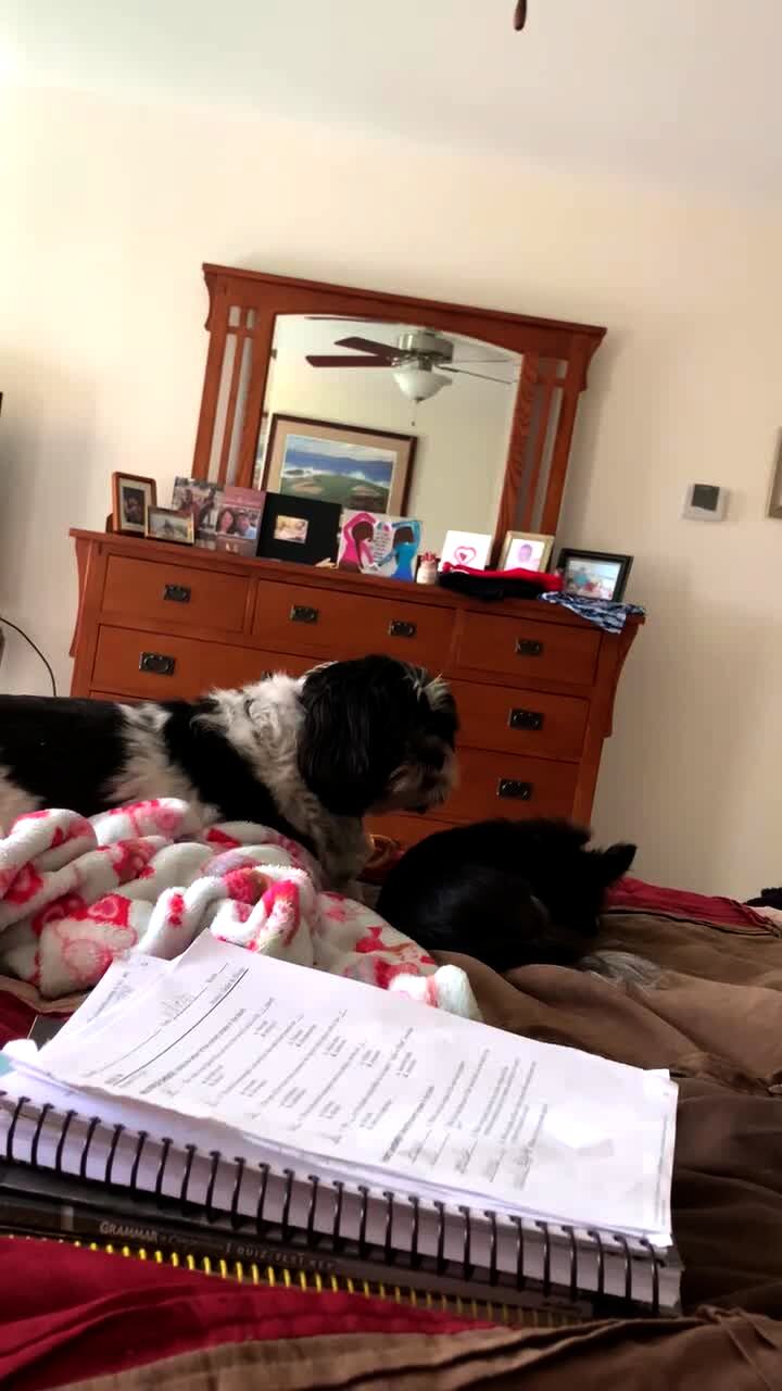 A woman does the "gasp at your dog challenge" and two dogs lie on the bed and turn quickly and look at her. An off camera girl says "what, what?"