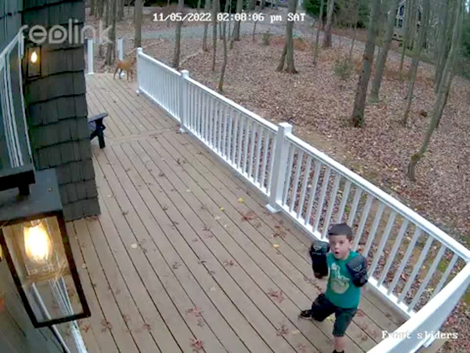 A tot boy has boxing gloves on and has an imaginary fight with someone on the deck. He says, "You want some pizza from me?" He probably means, "You wanna piece of me?" Security Camera Footage.