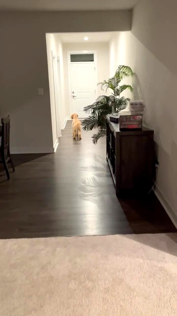 A dog stands in the hallway holding a bag of "Garden Veggie Straws" snack sticks in his mouth. A man off camera asks the dog where he is going. The dog stops to stare at the man for a moment. Then the dog slowly walks away.