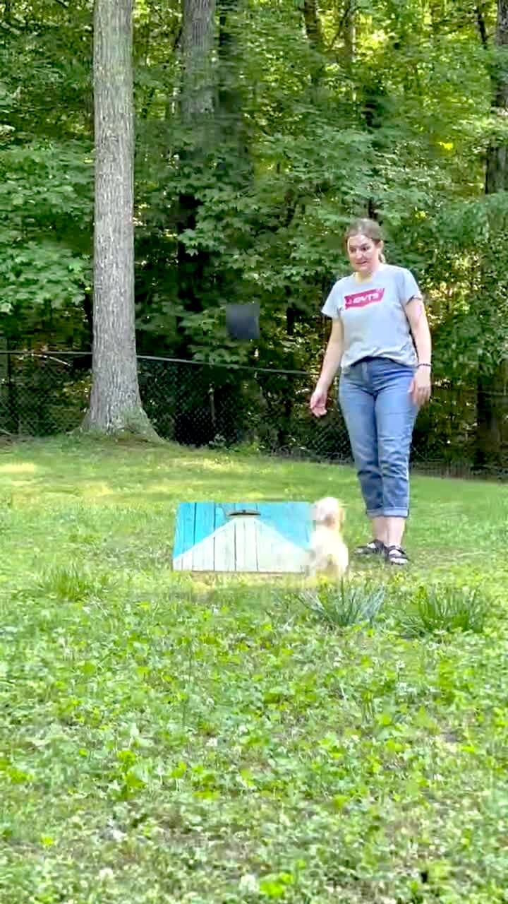 In a yard, a dog pokes its head out of a corn hole board to collect all the beanbags.