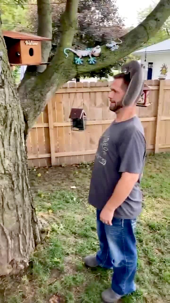 A man takes a squirrel off of his shoulder and puts it on a tree in a yard, then the squirrel jumps back onto him and sits on his head. A woman and a golden retriever dog watch. The dog barks.