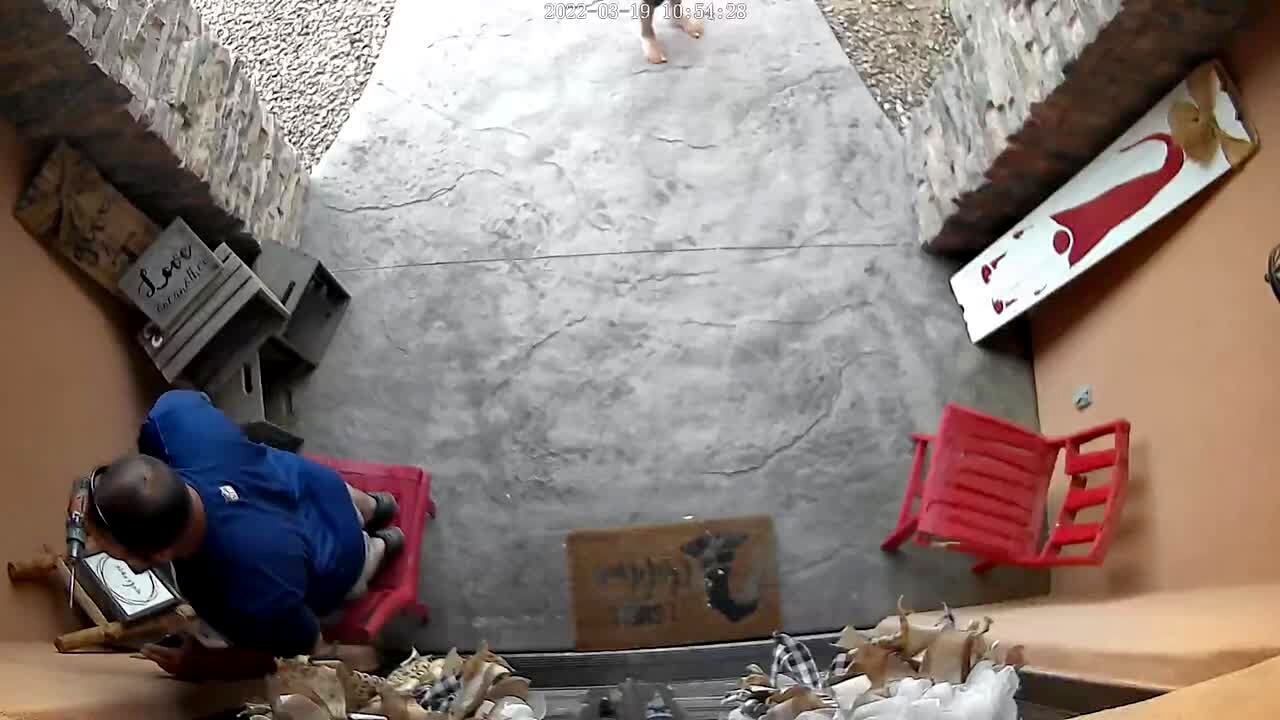 A man stands on an unstable chair while he tries to fix an outlet on a front porch when it breaks and he falls through the chair and onto the ground. Security footage.