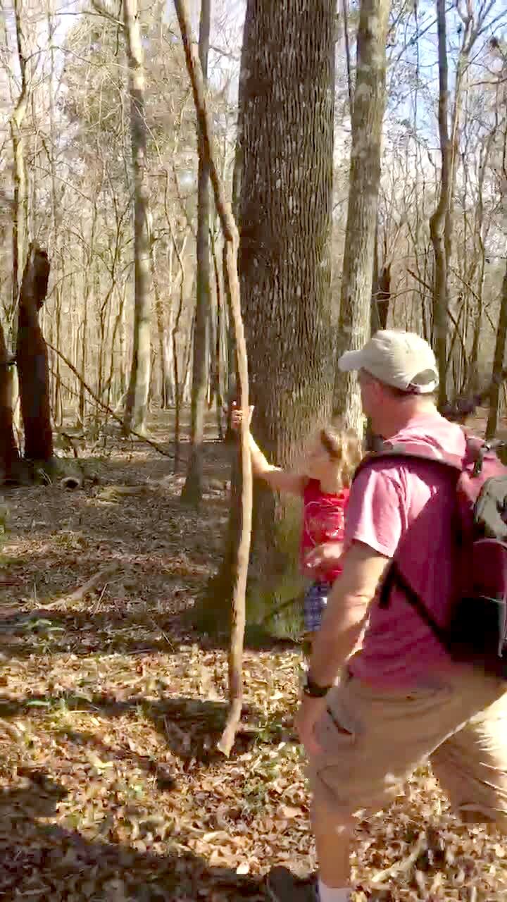 A young girl in the woods swings on a vine. A man tries too but the vine breaks and he falls.