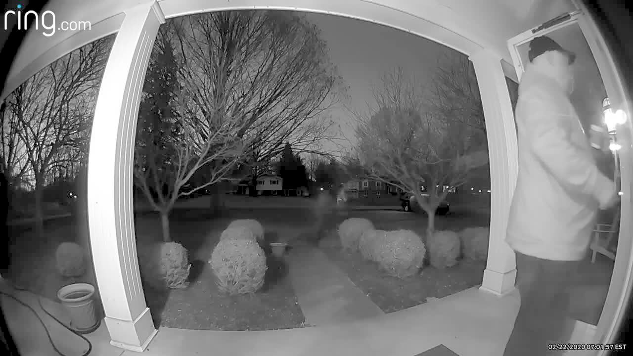 A man falls out of the front of the house and stumbles into the bushes. Home security footage.