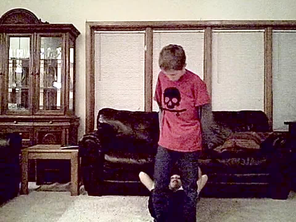 Boy sits on sister's feet who's lying on living room floor, girl launches boy into camera as boy says "I gotta fart."