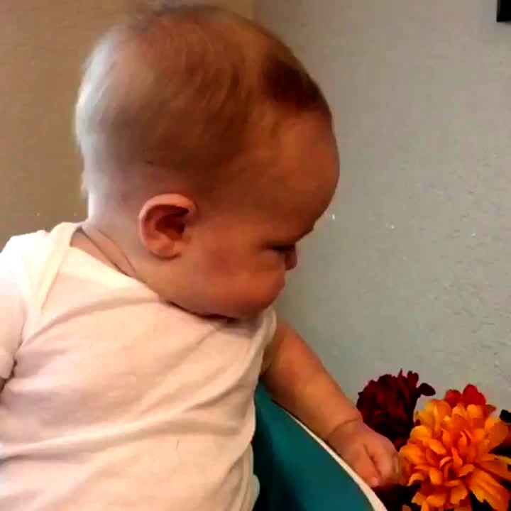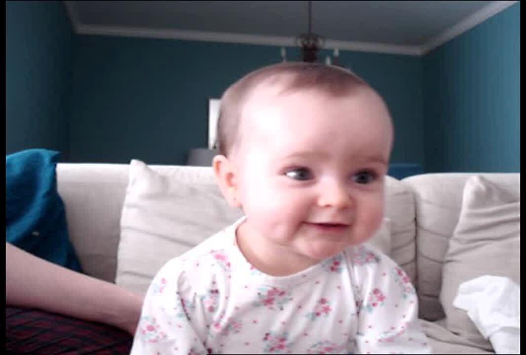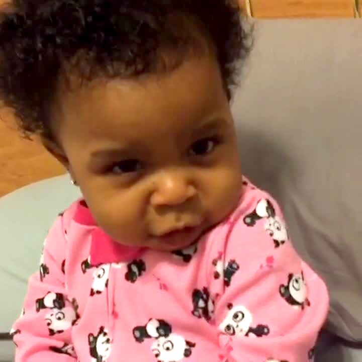 Baby girl makes a stink eye face on command from mom. She squints her face up and looks like Popeye.