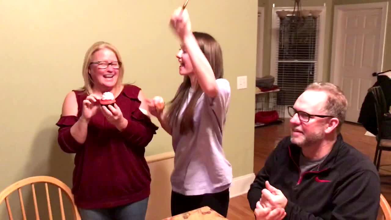 A family opens a box of cupcakes to reveal the gender of a woman's baby. The cupcakes are pink. Grandma is call excited that it is a girl, but then the cupcakes are pink outside but inside they are blue. It is a boy. Then Grandma is disappointed.