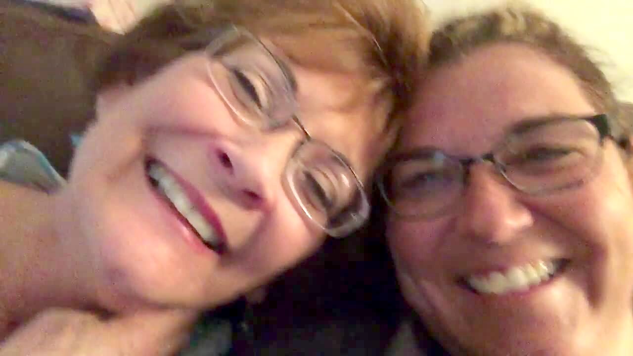 A woman records a video while another woman pulls her wrinkles back for a photo as they pose.