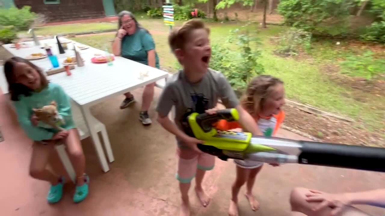 A senior woman sits in a chair and a young boy aims a leaf-blower at her face in the backyard.