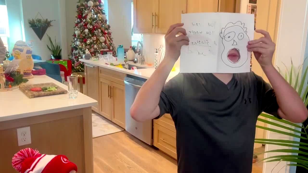 A young boy tells a senior woman in a kitchen that he made her a card that sings. He opens the card to show that there is a hole cut out of it, then he puts his face in the hole and sings "Happy Birthday" and then "We Wish You A Merry Christmas."