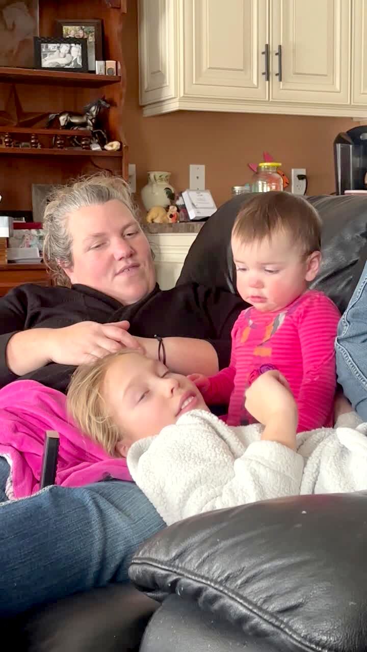 A mother encourages her toddler to kiss her older daughter. The older girl screams when her baby sister sneezes on her face repeatedly.