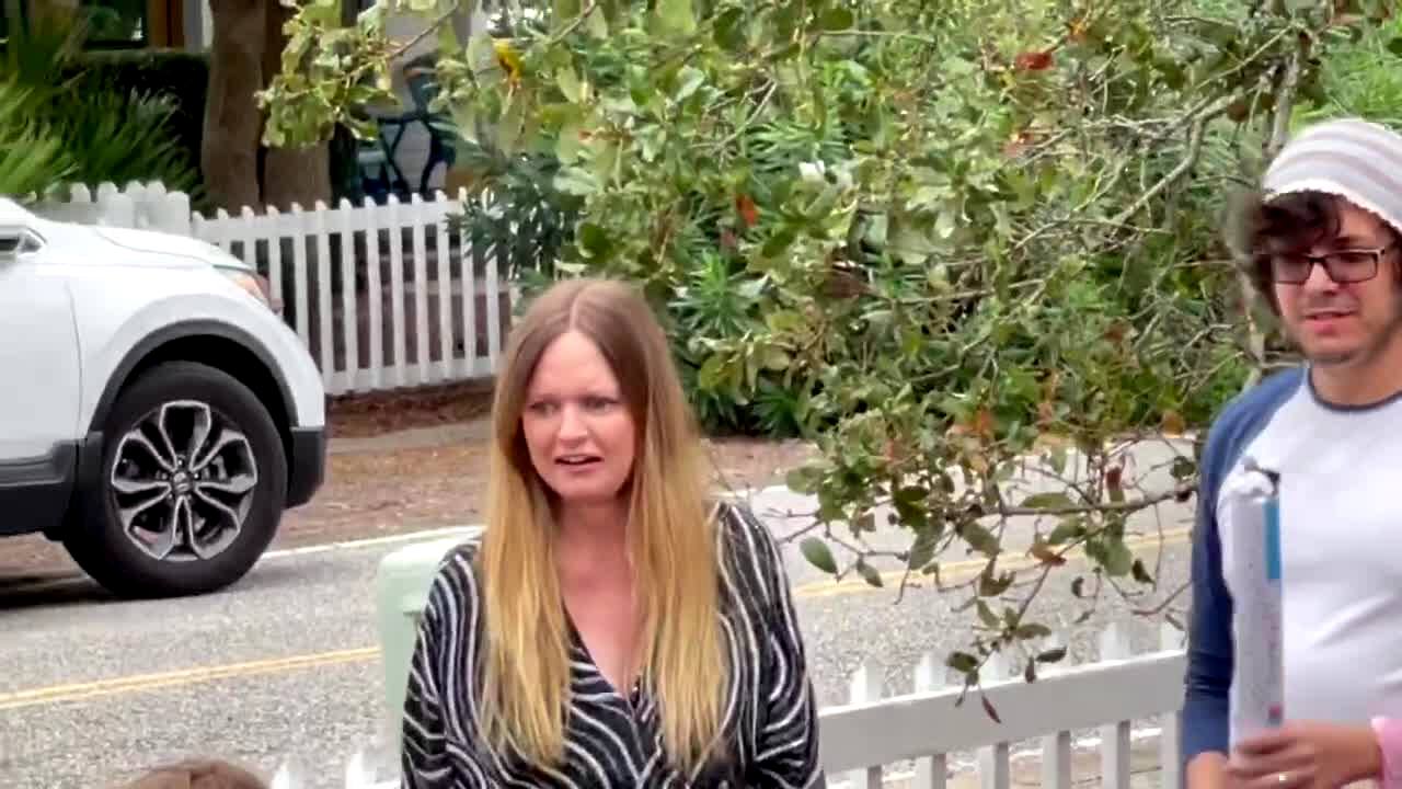 A gender reveal party and the woman looks confused when they pop off the tubes and she and the man each has a different color in a front yard.