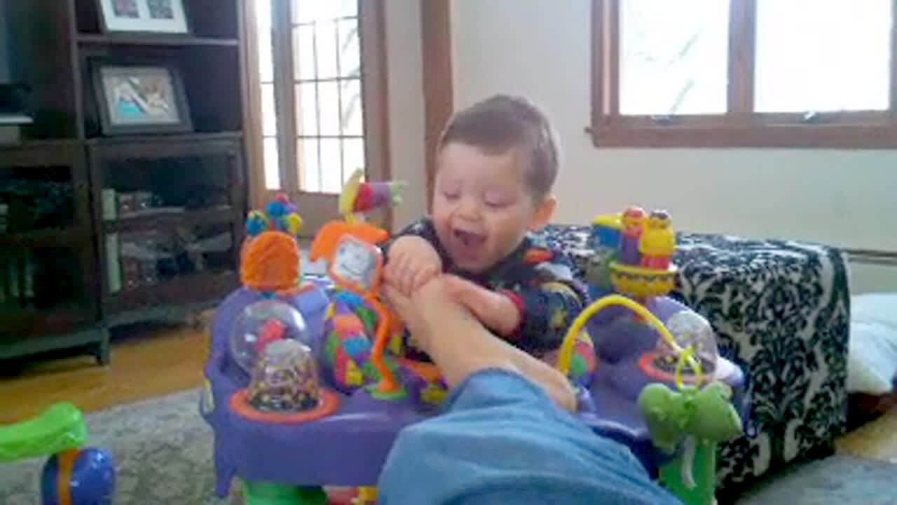 Baby boy in a walker seat laughs when dad sticks his foot on the seat in living room.