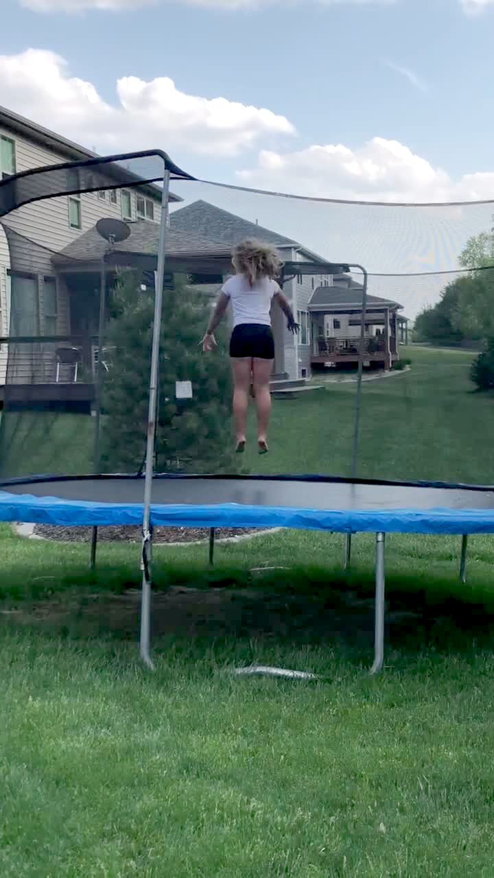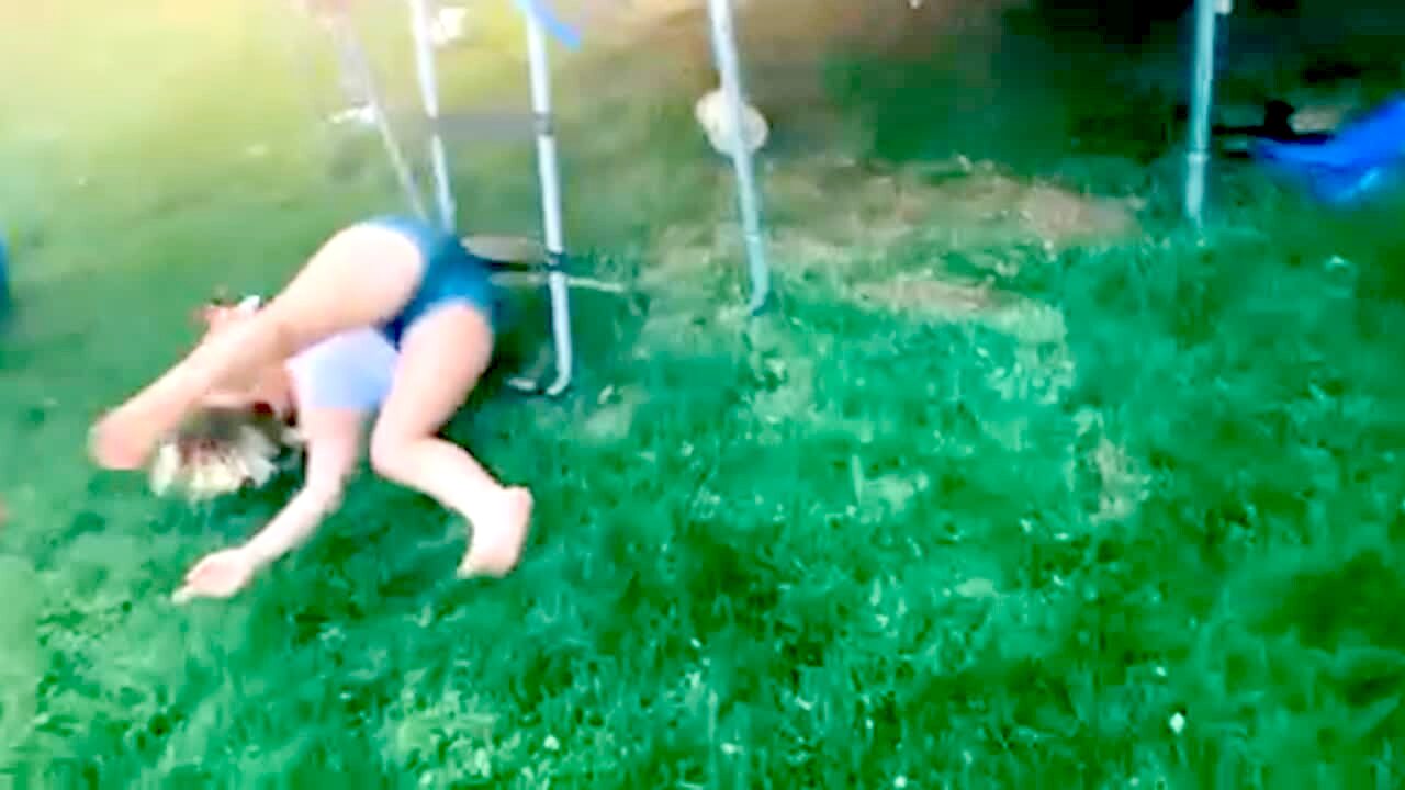 A teen girl falls on the ground in the backyard when a trampoline breaks as she jumps on it.