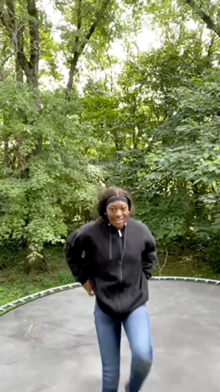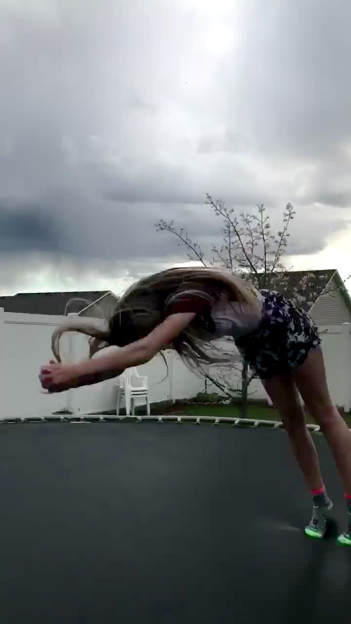 A teen girl jumps and does a spin then falls through the middle of a trampoline in the yard.