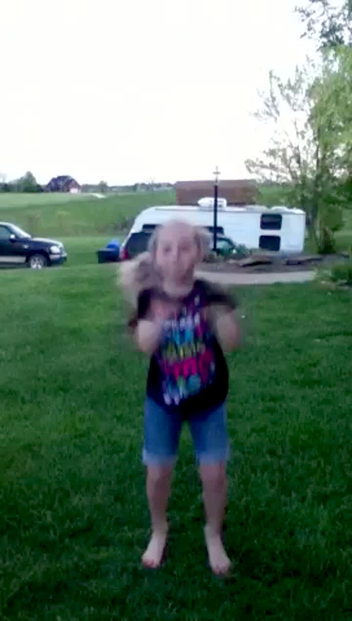 A young girl does a back flip on a trampoline in the yard. She lands on her knees and bounces off the edge of the trampoline. She almost falls, but lands on her legs. The woman with the camera asks if she is okay and the girl says "yeah, I landed it."
